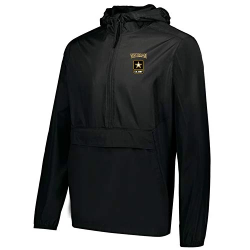 Ready to wear, water resistant pullover will be your new go to Fall jacket! Show your service pride wearing your new half zip pullover style, hooded jacket. The large zippered front pocket can be used to fold your jacket into for storage or use as a pillow! Treat yourself or makes a great gift for your favorite veteran.