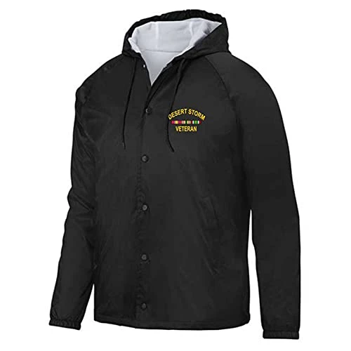 Desert Storm Veteran Jacket Embroidered Hooded Windbreaker with Ribbons Graphic. VetFriend. Show your service pride wearing your soft-lined water-resistant nylon jacket. Snap-front closure with slash front pockets makes it easy to maneuver in and out of while keeping you warm and comfortable. This is a custom-made embroidered sport hooded jacket. Treat yourself or makes a great gift for your Veteran.