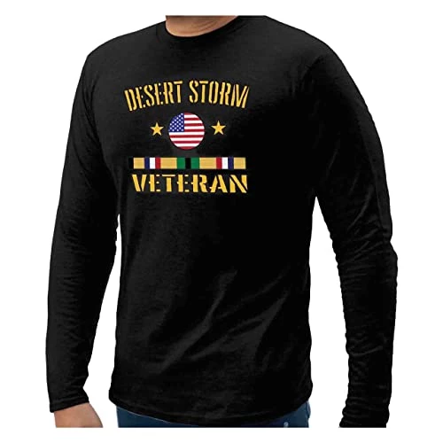 Desert Storm Veteran T-Shirt with US Flag and Ribbon Graphic. Show your service pride wearing this comfy long sleeve shirt. Heat pressed technology in the USA -Fabric Imported. Cotton-Blend for extra comfort
